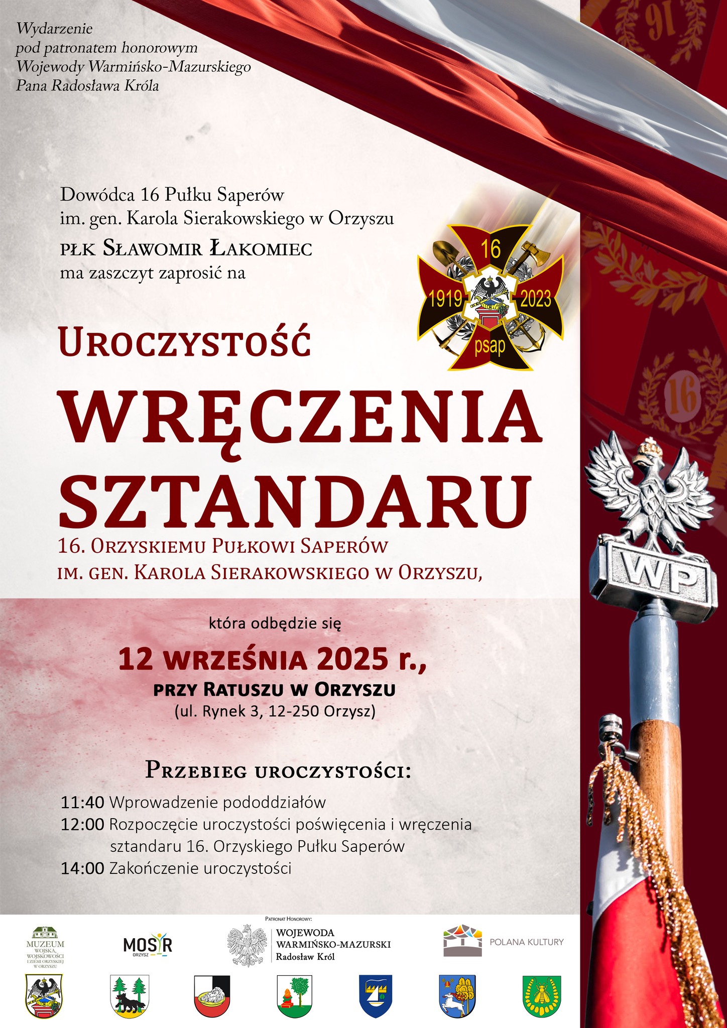 mamy zaszczyt zaprosić Państwa na niezwykle ważne i historyczne wydarzenie – uroczystość wręczenia sztandaru 16. Orzyskiemu Pułkowi Saperów im. gen. Karola Sierakowskiego w Orzyszu, które odbędzie się 12 września 2025 r. o godz. 12:00 przy Ratuszu w Orzyszu (ul. Rynek 3).